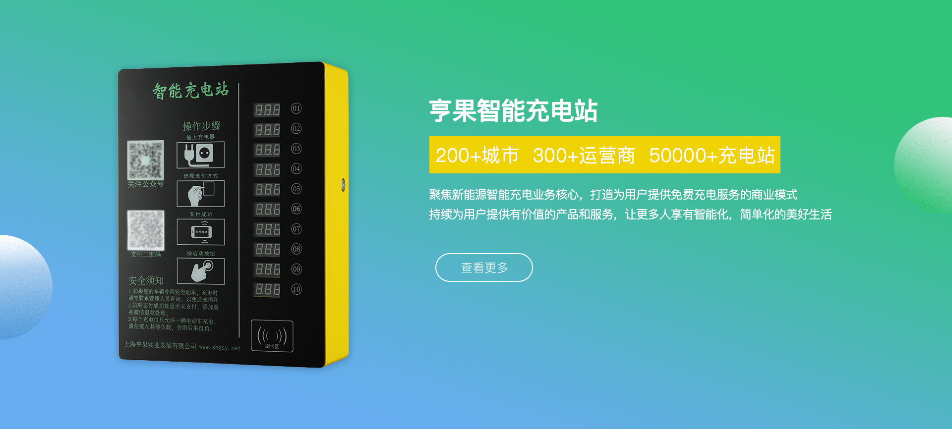 公司總部位于上海市青浦區(qū)趙巷新城經(jīng)濟開發(fā)區(qū),專注于新能源智能充電操作系統(tǒng)、智能電動車充電樁、充電樁行業(yè)運營管理平臺等多類相關 產(chǎn)品的研發(fā)、設計、銷售和運營,產(chǎn)品現(xiàn)已廣泛應用于國內各城市居民社區(qū)、高校、及商業(yè)綜合體車輛聚集區(qū)域及市政配套領域。